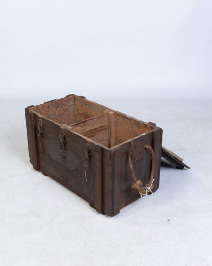 Vintage military wooden storage box. Restored and revived by On The Square Emporium. Rustic container, shows signs of age with wear and staining. Metal hardware and rope handles.