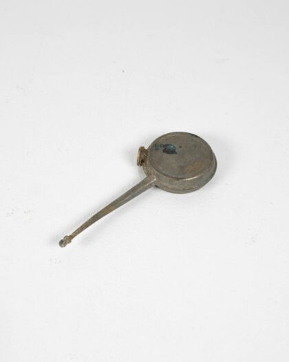 This is a vintage metal oiler can, featuring a round body and a long, slender spout. The metal has a greyish-silver tone and displays signs of wear, which adds to its vintage aesthetic. The spout is slightly curved. The top of the oiler is a flat, round surface with some areas of oxidation. The metal exhibits a patina consistent with age and use. This oiler can be displayed in a garage, workshop, or used as a decorative piece.