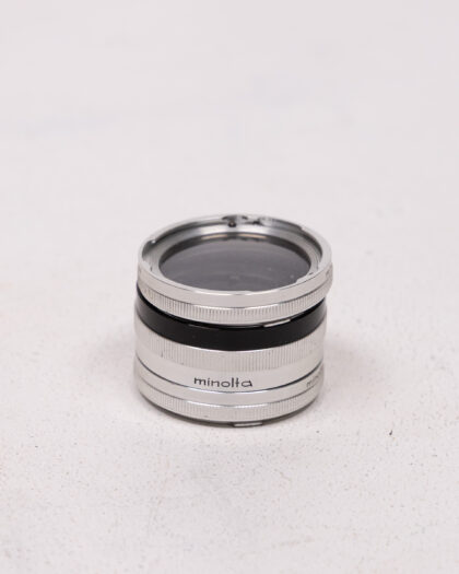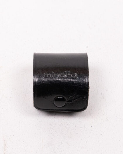 Vintage Minolta camera lens with original leather case. The lens is silver with a black accent and is in good condition.