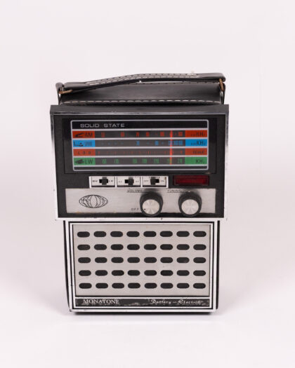 Vintage Monatone Solid State battery-electric radio in black leather-look case with silver-coloured accents. Untested.