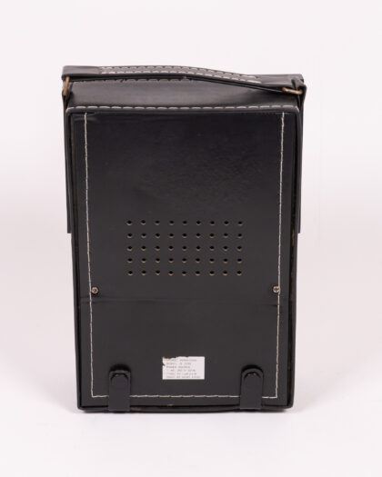 This is a vintage Monatone Solid State battery-electric radio, a piece of technological history. Encased in a black leather-look material with white stitching, the radio features a silver-coloured metal speaker grill and control panel. The tuning and volume controls are intact. The radio band display is clear, showing AM, LW, MW. The back of the radio features ventilation holes and information. Cosmetically, it shows signs of age but maintains its vintage charm. Untested.
