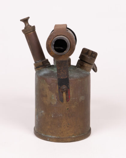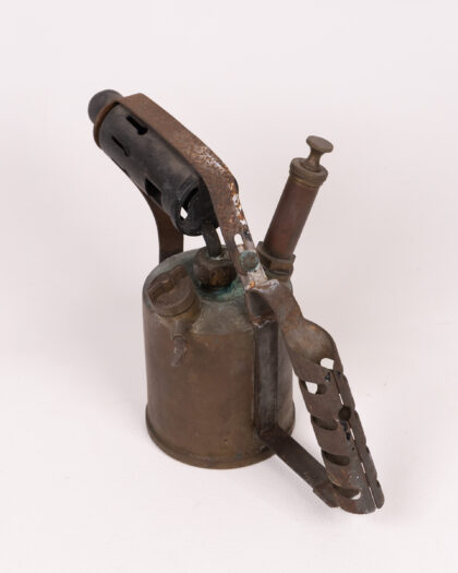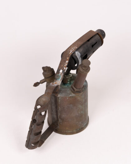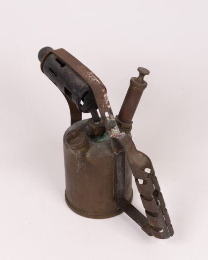 A vintage Monitor No. 26 blowtorch. This antique tool is made primarily of brass and steel, with a riveted steel handle and a black steel nozzle piece. The brass has a naturally aged patina, with some green discolouration in places. "Monitor" is stamped into the brass tank. This blowtorch shows signs of wear and use consistent with age, and the handle shows some surface rust.