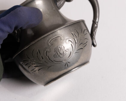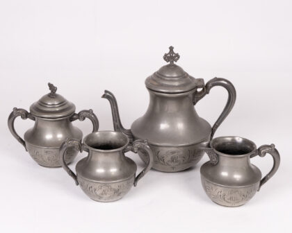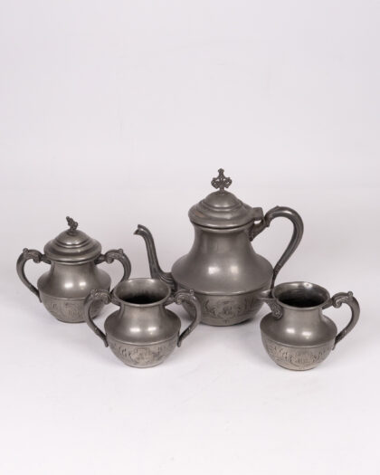 Vintage Metal tea set. Includes teapot, sugar bowl, and creamer, all with ornate engraved designs and monogram. Good vintage condition.