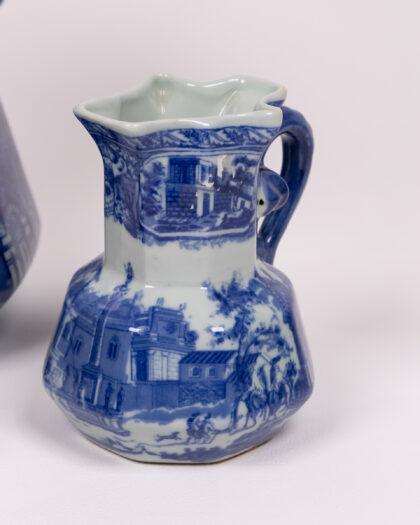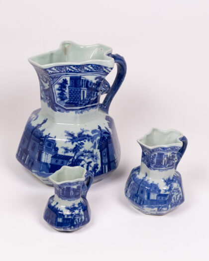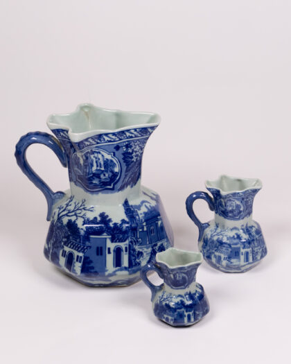 Vintage graduated set of 3 blue and white Moonstone ceramic jugs with transferware design. Unusual scalloped openings. Lovely decorative items.