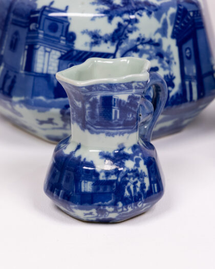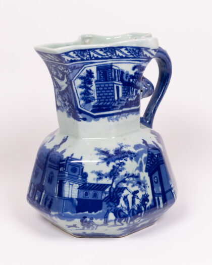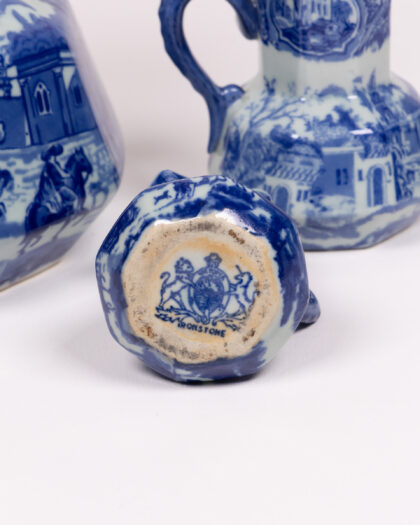 This is a set of three graduated-size vintage jugs, all featuring a similar blue and white transferware design depicting pastoral scenes and buildings. The jugs have an unusual scalloped opening and decorative handles. The base of one jug is stamped with a crest design and the word 'Moonstone'. There are no obvious chips or cracks visible in the images, these are charming decorative items.