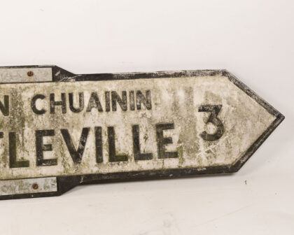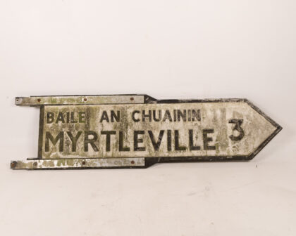 Original vintage road sign indicating the direction to Myrtleville, also inscribed with 'Baile An Chuainin' in Irish Gaelic. Constructed from cast metal with a weathered, aged finish. Features a directional arrow shape and mounting brackets on either side. Shows signs of outdoor use, including moss and staining, adding to its authentic vintage charm. Perfect for collectors of vintage signage or those looking to add a unique piece of Irish history to their decor. 102cm x 29cm