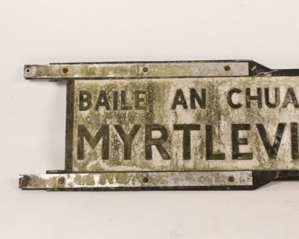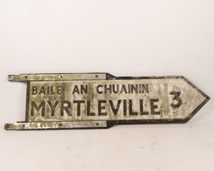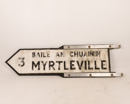 Vintage Myrtleville road sign with Irish inscription. Cast metal, weathered finish. A unique piece of Irish history for collectors.