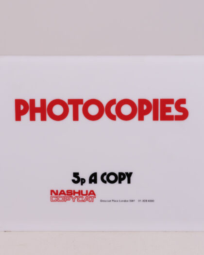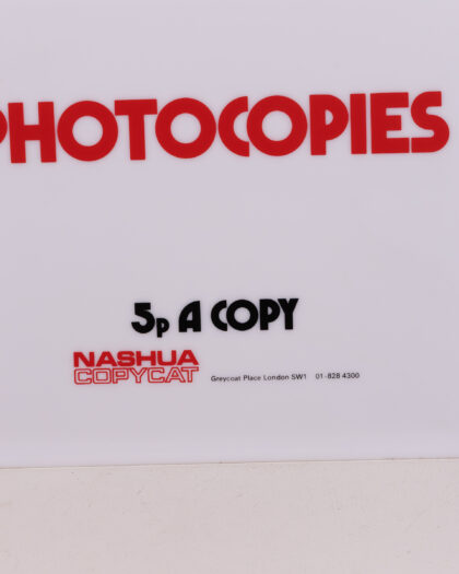 Add a touch of retro flair to your workspace with this vintage Nashua Copycat 'Photocopies' sign. The sign features bold red lettering against a white background, advertising 'Photocopies 5p A Copy.' This sign dates back to when the company was at Greycoat Place, London. The sign's design offers a nostalgic nod to the past, capturing the essence of the era. It is made of durable plastic. This vintage sign is in good condition. It is ready to be displayed and admired. It is a piece of history that brings a touch of vintage charm to any environment.