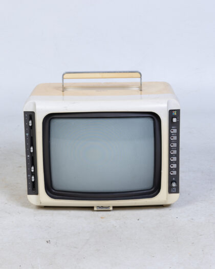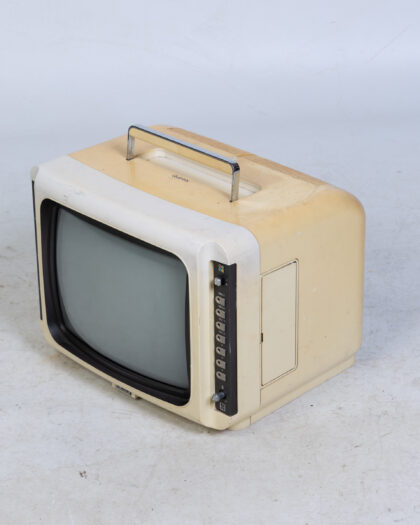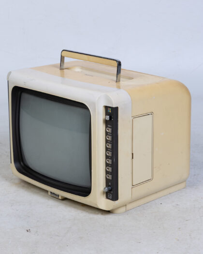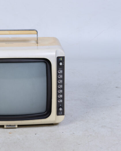 Vintage National TC-68G Colour TV with metal carry handle, featuring cream & white plastic casing. Ideal as a retro display prop for collectors. Untested.