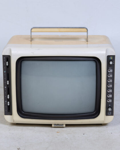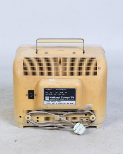 Discover this authentic Vintage National Colour TV, Model TC-68G, a captivating retro piece perfect for collectors and interior enthusiasts. This charming television features a classic cream and white plastic casing, complemented by a sleek silver metal carry handle. Detailed channel selection buttons adorn the side, while the iconic 'National' logo is proudly displayed on the front. The rear panel provides original power requirements and model information, affirming its historical authenticity. Ideal as a unique display prop for living rooms, home offices, or man caves, this 1970s Japanese television embodies vintage cool. Please note, this item is being sold as a collectible decorative piece and has not been tested for functionality. The casing exhibits typical age-related wear and discolouration, contributing to its authentic vintage character.