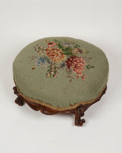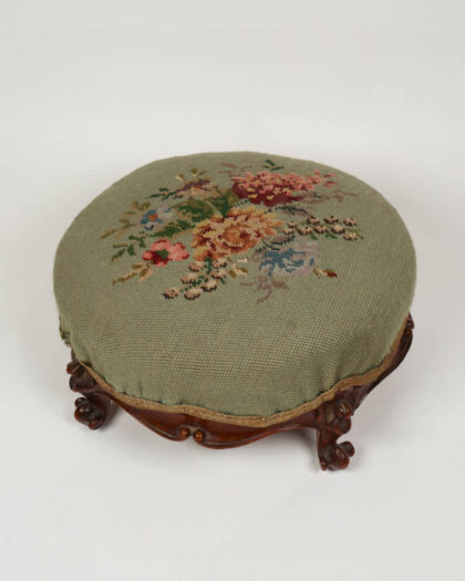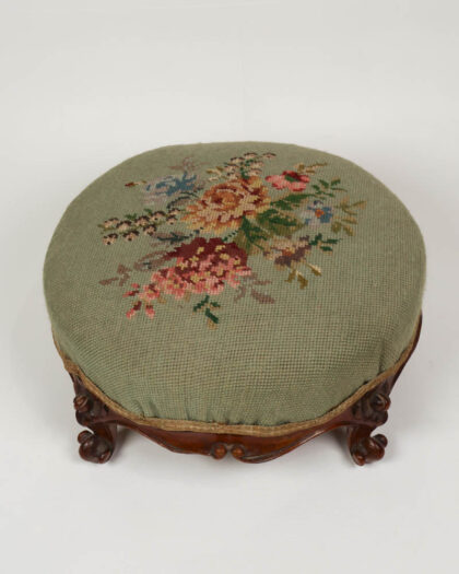 Vintage footstool with green needlepoint floral top and ornately carved wooden legs. Shows some wear. Perfect for any room.