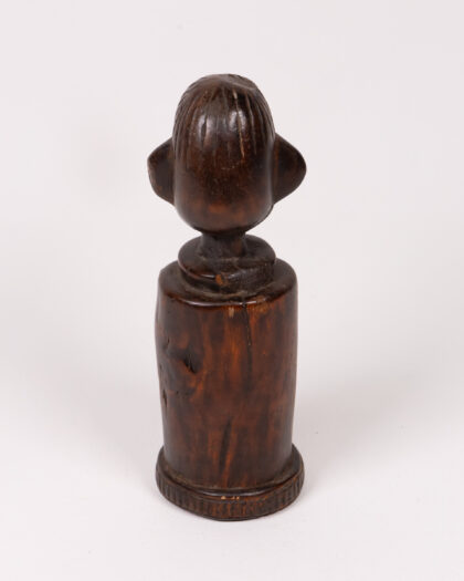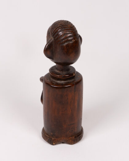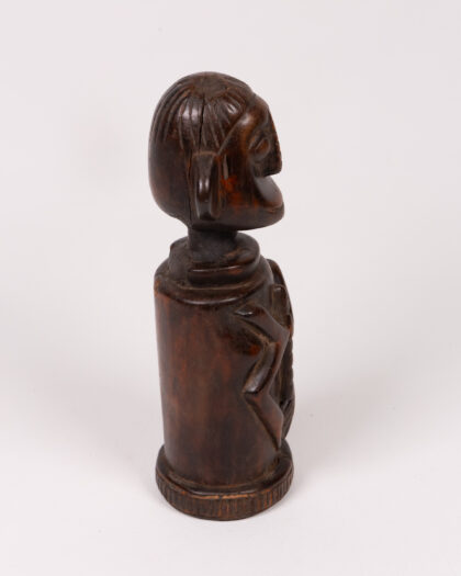 This is a vintage hand-carved wooden Chamba doll originating from Nigeria. The doll features a cylindrical body with a carved geometric design resembling a bow and arrow. The head has stylised facial features including protruding ears, a flattened nose, and a small smiling mouth. The wood has a dark brown tone and has developed a rich patina over time. There are some minor marks and wear consistent with age and use. This unusual tribal art doll would make a unique sculptural addition to any home.