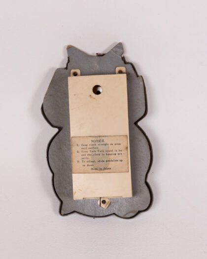 This is a vintage elephant clock, possibly from the 1950s-1960s era. It appears to be made of a ceramic or plastic material. It is grey with a red bow and has a black border around the clock face. The clock appears to be in fair condition, with some cracks in the plastic around the elephant's head. The clock face is cream with black numbers and hands. The reverse side contains a sticker that states "Made in Japan".