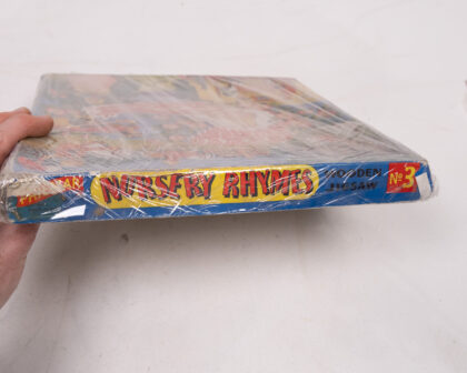 This is a vintage 'Nursery Rhymes' wooden jigsaw puzzle. The puzzle depicts scenes from classic fairy tales and nursery rhymes in a colourful, illustrative style. The puzzle is still in its original packaging. There is minor wear to the edges of the box. The packaging has some tearing, but the puzzle itself appears to be in good condition considering its age.