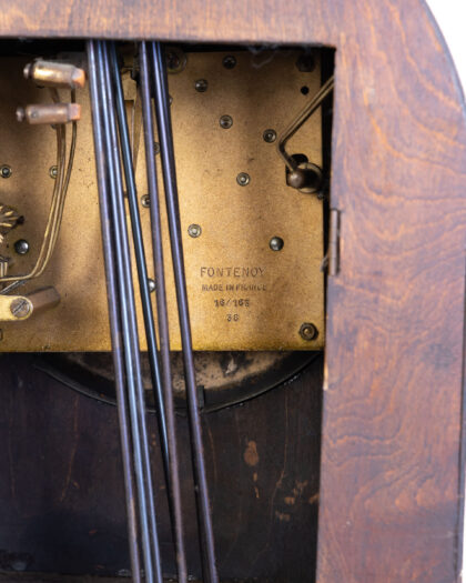 Discover this authentic FONTENOY vintage French grandfather clock, meticulously crafted from rich oak wood and stamped 'Made in France'. This elegant timepiece features a distinctive silver-toned clock face with clear numerical markings, set beneath a gracefully curved hood. The warm, light brown oak showcases a beautiful natural grain, adding to its timeless appeal. A unique diamond-shaped detail is subtly integrated on the front of the clock below the face, enhancing its character. The clock's glass door opens to reveal the intricate inner workings, a testament to its craftsmanship. This eye-catching piece will serve as a distinguished focal point, adding a touch of vintage elegance and historical charm to any room.