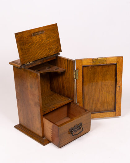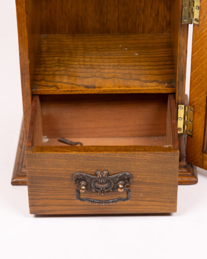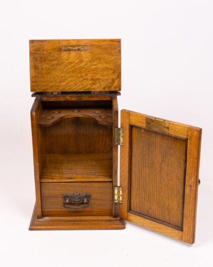 This is a vintage wooden pipe box, featuring a hinged lid and a decorative metal latch. The box is made of oak and includes a small drawer with an ornate metal handle. Inside, there is a pipe rack and storage space. The front panel has a black, embossed design. The item appears to be in good condition with some wear, adding to its vintage charm. It combines functional storage with decorative appeal.