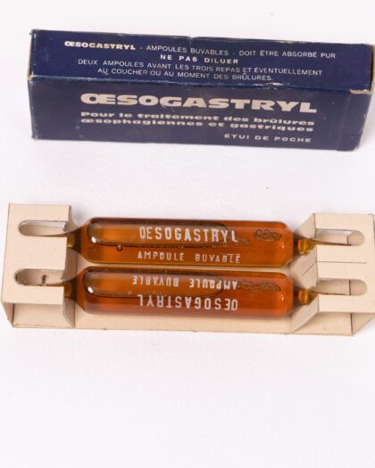 A vintage box of Oesogastryl ampoules. The box is blue with white lettering, detailing the product name and usage instructions in French. Inside the box, two ampoules are visible, housed in a cardboard holder. The ampoules are filled with a brownish liquid. The box shows some signs of age. This is a collectible item and is not intended for use.
