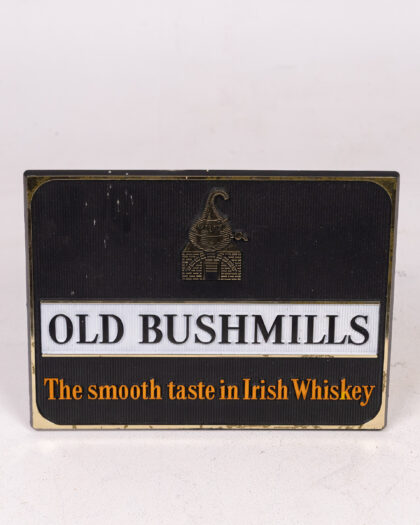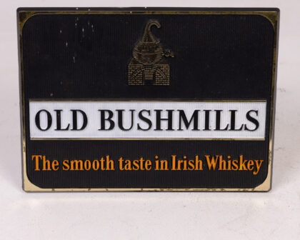 This vintage Old Bushmills Irish Whiskey plastic sign is perfect for collectors of breweriana. Features the iconic Bushmills distillery logo and branding. Made from durable materials with a stand on the back, this sign would be ideal for display in a home bar, games room, or kitchen. Some minor wear consistent with age adds to its charm and authenticity. The sign promotes 'The smooth taste in Irish Whiskey'. A piece of Irish distilling heritage.
