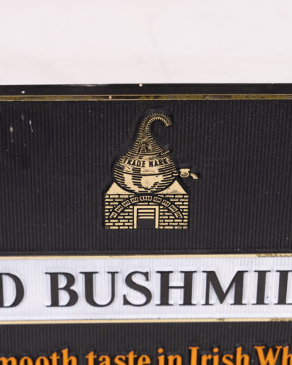 Vintage Old Bushmills plastic sign. Perfect for any whiskey lover or collector of brewery memorabilia. Stand on back for display.