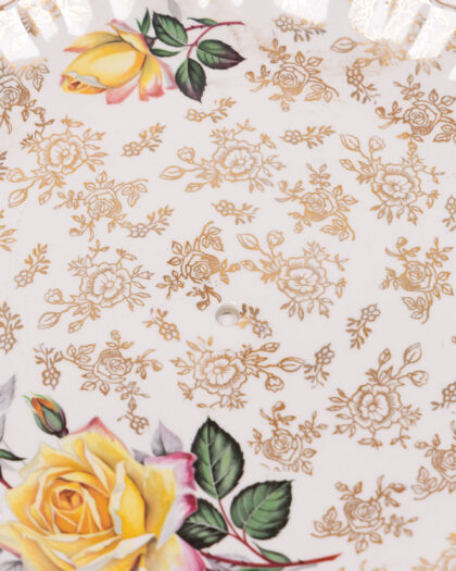 A stunning vintage Old Foley cake stand, made by James Kent Ltd, Staffordshire, England. This decorative plate features a beautiful floral design of roses in hues of yellow and pink with green leaves against a white backdrop. Gold detailing is used extensively to outline the roses, add a border and create a pattern of small flowers on the white background. In great condition, with slight wear commensurate with age.