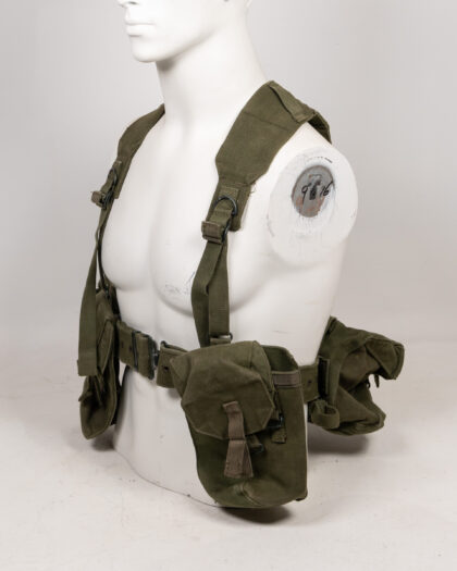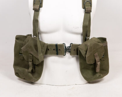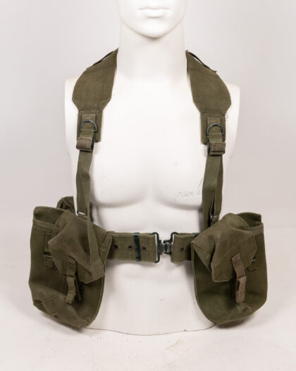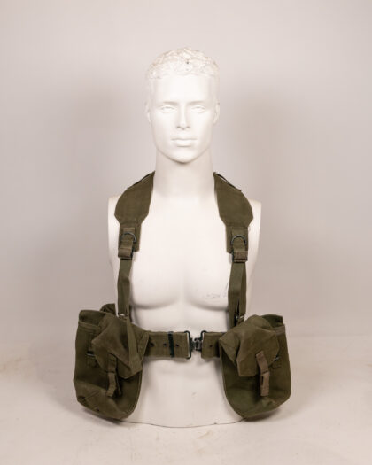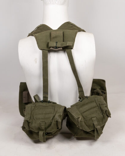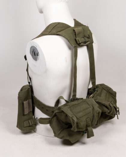 Vintage olive green military webbing load-bearing vest. Features adjustable shoulder straps with metal buckles and D-rings, a waist belt with a metal clasp, and multiple pouches. This robust vest is designed for carrying essential gear and equipment, suitable for military collectors or reenactors. Excellent condition, showing minimal signs of wear. A practical piece of military history.