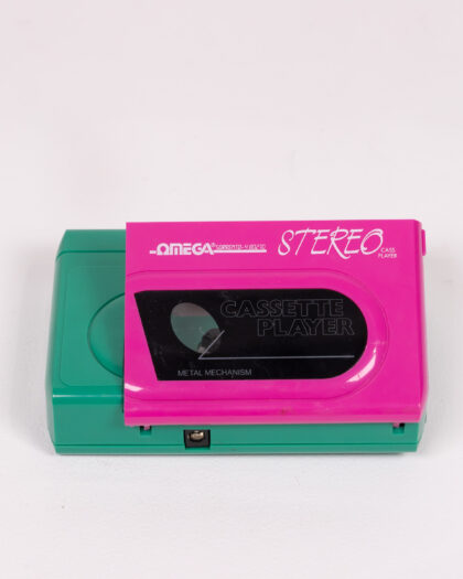 Vintage Omega Stereo cassette player. Features a green and pink plastic case. The top features blue play, rewind, and stop buttons. The cassette door is pink. Label on the front says 'Omega' and 'Stereo Cassette Player'. Metal mechanism. A great example of 80's electronics. Untested.