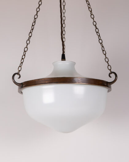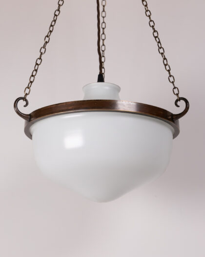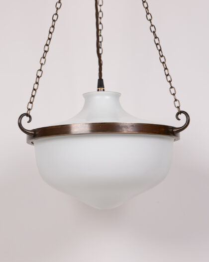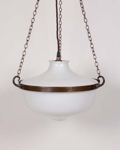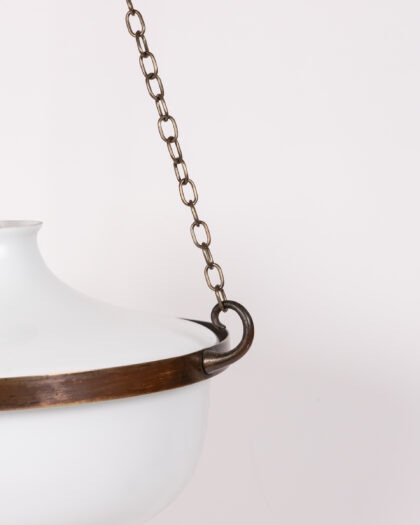 Illuminate your space with this exquisite Vintage 1930s Opaline Glass Globe Pendant Light. Dating from around 1930, this original light fixture features a beautifully diffused white opaline glass globe, exuding a soft, ambient glow perfect for creating a warm and inviting atmosphere. The globe is elegantly suspended by a dark brown metal frame and aged brass-tone chains, adding a touch of classic charm and durability. Completing its authentic vintage appeal is a brown braided electrical cord. With its clean lines and minimalist design, this pendant light offers timeless elegance that seamlessly complements a wide range of interior styles, from traditional to contemporary. The light is presented in very good condition, ready to be a captivating focal point in your home.