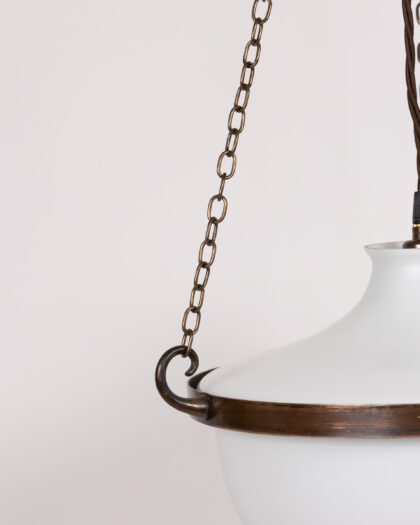 Vintage 1930s Opaline Glass Globe Pendant Light featuring a white glass globe, dark brown metal frame, and aged brass-tone chains. Complete with a brown braided electrical cord, this minimalist design adds timeless elegance and ambient light to any room.