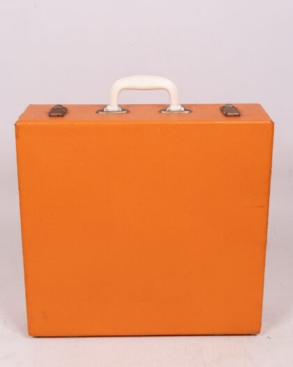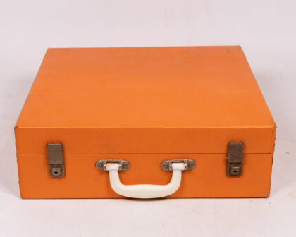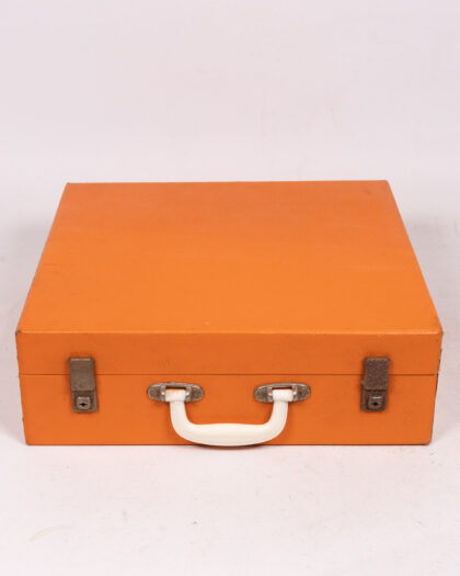 This vintage picnic set is a charming throwback to outdoor dining. The set includes plates, cutlery, cups, a thermos, and containers, all neatly organized in a bright orange carry case. The plates and containers appear to be made of melamine or a similar durable plastic, while the cutlery has cream-coloured handles. The thermos features a yellow body with a white lid and black base. The interior of the case is fitted with straps to secure the contents. The case is orange with metal clasps and a white plastic handle. This set is in good vintage condition, with some signs of wear consistent with age and use. It is perfect for picnics, camping, or as a decorative piece for a vintage-themed kitchen.