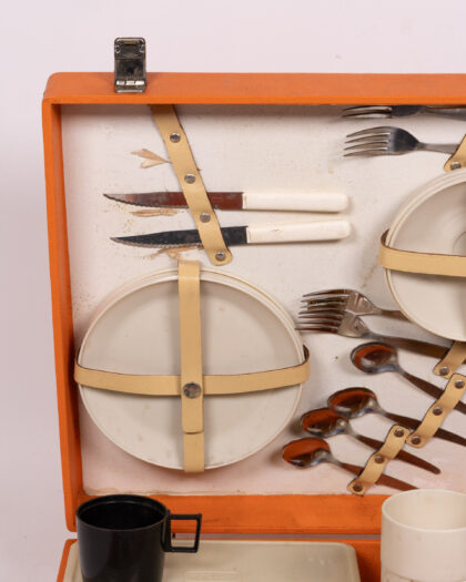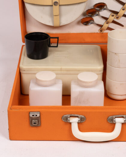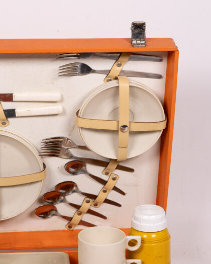 Vintage picnic set with orange case, plates, cutlery, thermos, and containers. Ideal for outdoor dining or retro decor. Great condition.