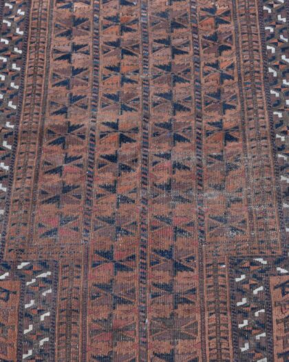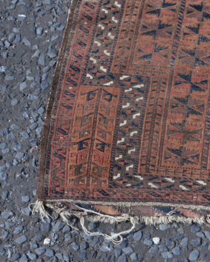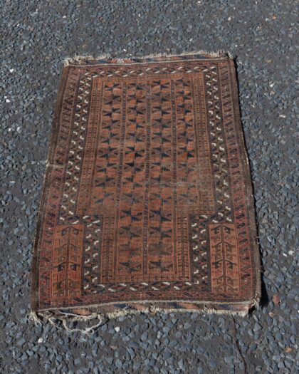 This is a vintage rug featuring a geometric oriental pattern. The primary colours are brown, black, and red, creating a warm and inviting palette. The rug is made of fabric and has fringed edges, which adds to its charm. It would be perfect for adding a touch of vintage style to any room. There is wear consistent with age but this adds to the vintage character of the rug.