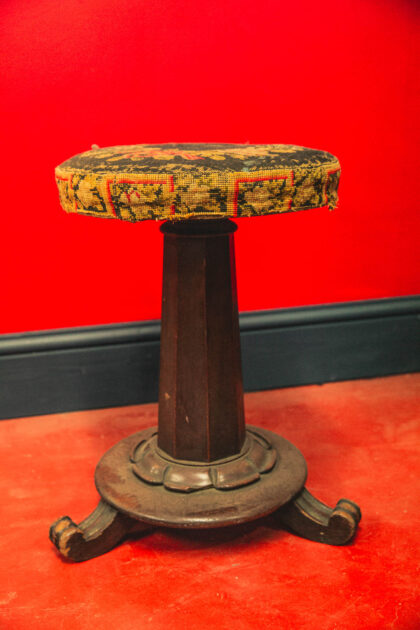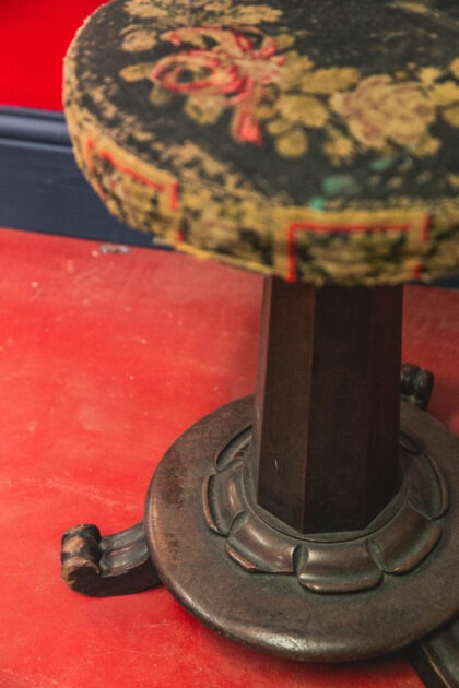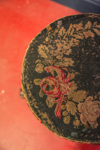 Beautiful wooden base with three carved feet. Crochet top seat.