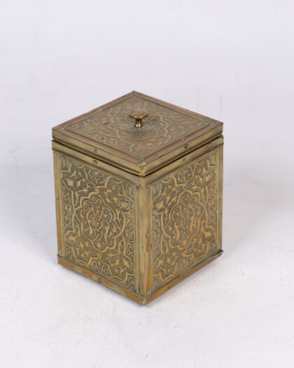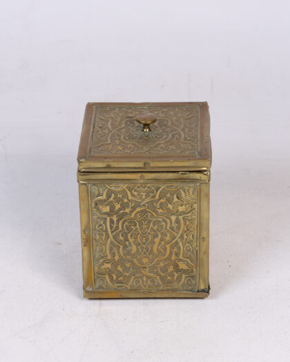 This is a small, square tea caddy made of brass. The caddy features intricate, ornate designs embossed on each of its four sides and the lid. A small, round knob sits atop the lid for easy opening. The interior appears to be lined with a different metal, possibly tin or steel, to protect the brass from corrosion. The overall condition is good, with a slight patina that adds to its vintage charm. There are some minor signs of wear and tear due to age, but it remains a beautiful and functional piece, perfect for storing tea or as a decorative item.
