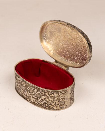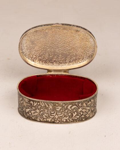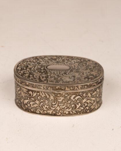 An intricately designed vintage silver oval box with floral engravings. Perfect for collectors and as a decorative piece.