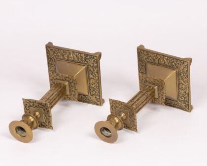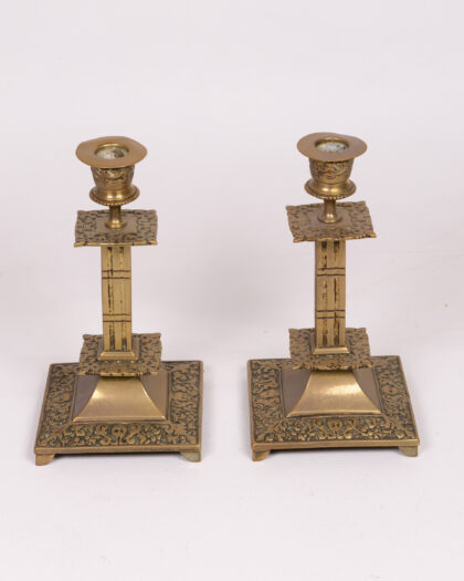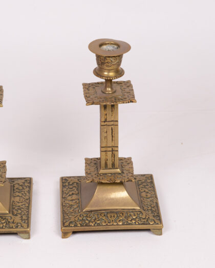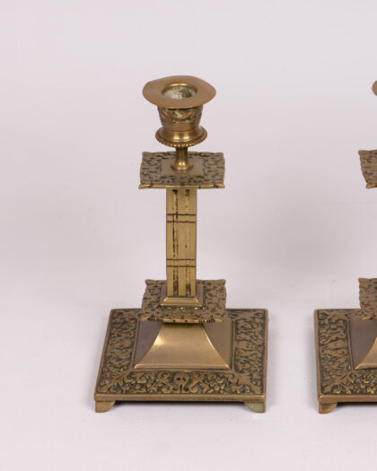 This is a pair of decorative candle holders crafted from brass. Each candle holder has a square base decorated with a foliage pattern, an ornamented centre column, and a raised candle seat. The candle seat also has engraved floral detailing around the edge. There is some surface tarnishing commensurate with age, but otherwise both are in good condition.