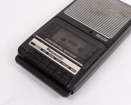 Vintage Panasonic RQ-2102 Slim Line cassette recorder in black. This portable recorder features AC/Battery power options and auto-stop functionality. Untested, sold as is. Shows cosmetic wear, dust and marks commensurate with age. Includes power lead.