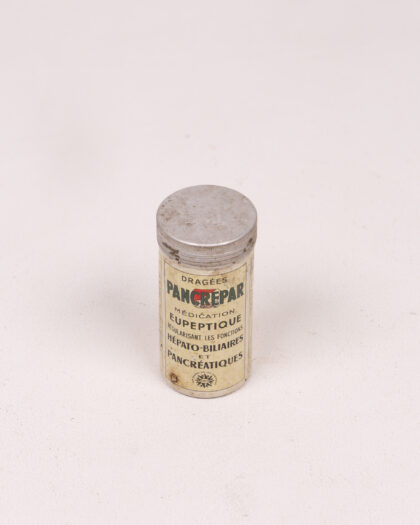 This is a vintage Pancrépar medication container, produced in France. The container is made of a metal body with paper label. The label has text in French, detailing the medication name, indications, and dosage. The lid is silver in colour and is likely made of aluminium. The label is adhered to the metal body of the container, showing signs of age and wear, including some discoloration and minor tears. This item represents medical history and pharmaceutical packaging from the mid 20th century.