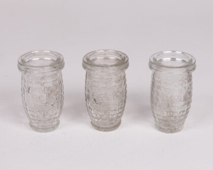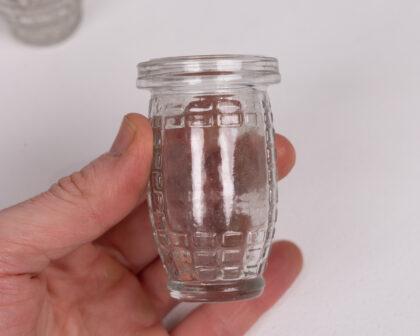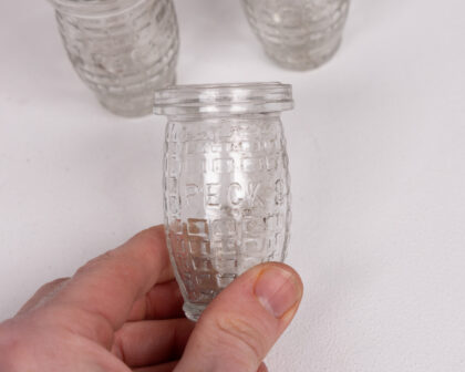 Vintage Peck's Potted Meat Paste clear glass jar. Features a distinctive grid pattern with embossed 'PECK'S' lettering. Shows signs of age and use with some internal residue. These charming jars offer a glimpse into the past and could be used for small storage or display. Condition is good, with some signs of age-related wear but no cracks or chips.