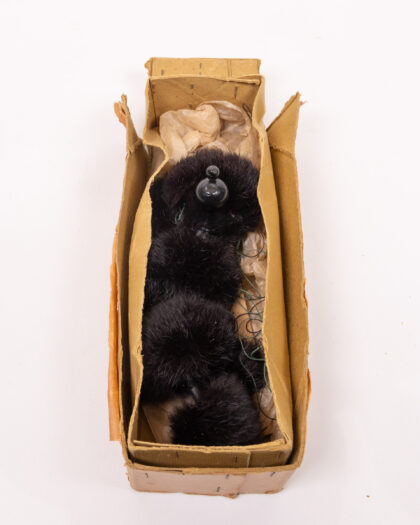 This is a vintage Pelham Puppets Simple Dancing Puppet, complete with its original box. The puppet features a fuzzy black material and is in good condition, ready to bring a bit of nostalgia to any collection or playroom. The box shows signs of wear consistent with age, including scuffs and creases, which adds to its vintage charm. Made by Pelham Puppets Ltd. Marlborough. Includes easy illustrated instructions.