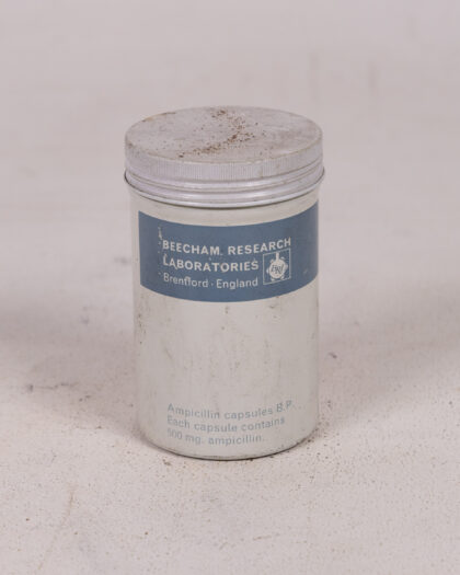 Discover a piece of pharmaceutical history with this authentic vintage 'Penbritin' medicine tin from Beecham Research Laboratories, Brentford, England. This charming collectible features a striking white background adorned with bold blue 'Penbritin' lettering and distinctive red block accents. The tin is topped with a secure silver metal lid. An original label, with its faded ink and handwritten notes, adds to its unique character and historical appeal. This piece beautifully showcases the authentic patina of age, including natural discolouration and minor surface scratches, testament to its journey through time. The base is notably stamped with 'Metal Box Made in England', marking its origin. Ideal for collectors of vintage advertising, medical memorabilia, or as an intriguing decorative accent for a home office, library, or living space.
