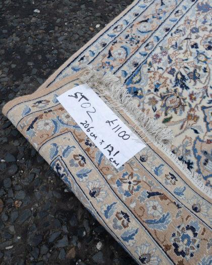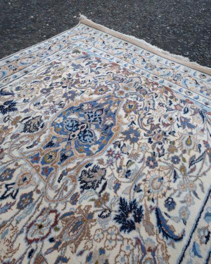 Discover the timeless elegance of a vintage Persian Nain rug, finely woven with wool on silk. This exquisite piece, aged 60 years, boasts a full pile and represents the highest grade of craftsmanship. Its intricate blue and beige patterns add a touch of luxury to any interior.
