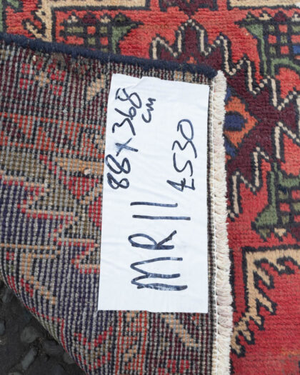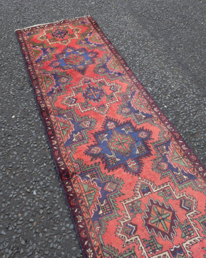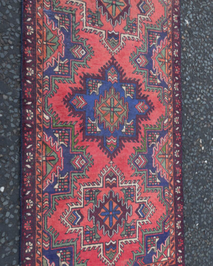This is a vintage Persian Tabriz runner featuring a washed red ground and a cross door medallion design. The runner showcases intricate geometric patterns in shades of red, blue, green, and cream. The design includes a central medallion with smaller geometric motifs repeated along the length of the rug. The rug shows signs of wear consistent with age, adding to its vintage charm. There is some fading and minor wear to the pile, typical of vintage rugs. This runner would make a stylish addition to a hallway, living room, or bedroom, adding a touch of Persian elegance to any space.
