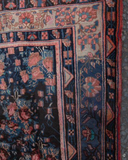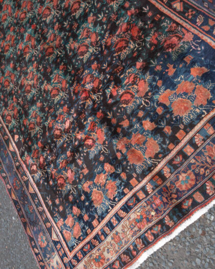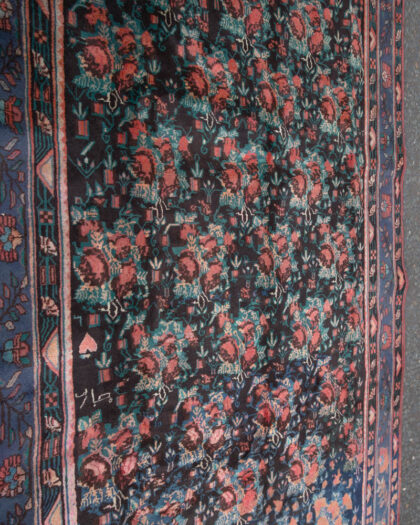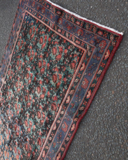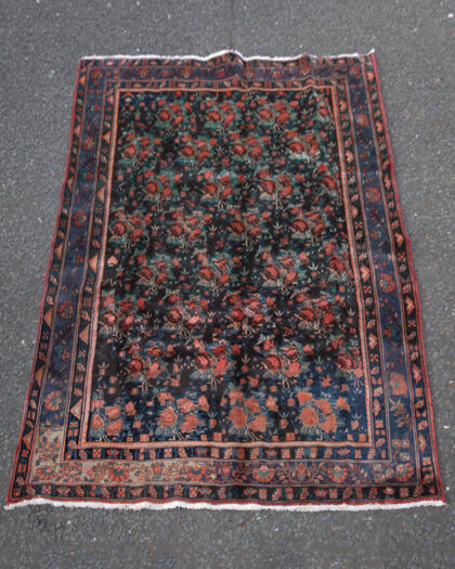 This is a vintage Persian rug showcasing an intricate floral design in a palette of blue, red, and black. The rug is constructed from wool, providing a soft and durable texture. The pattern features densely packed floral motifs arranged across the central field, bordered by complex geometric and floral designs. The edges are finished with fringed detailing. Considering its age, the rug is in good condition, though there may be signs of wear that are consistent with age and use. This rug would be a striking addition to a living room, bedroom, or study, adding warmth and a touch of elegance to the space.