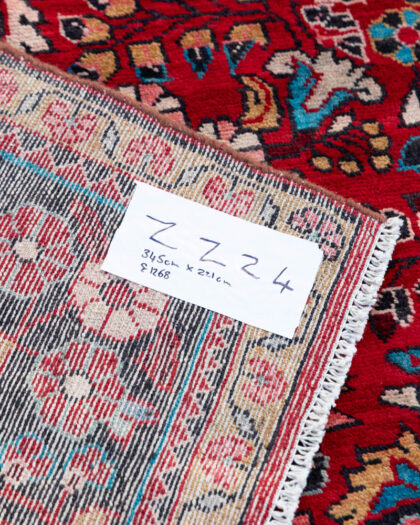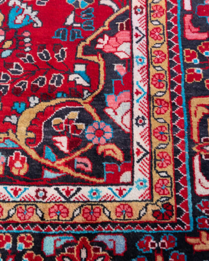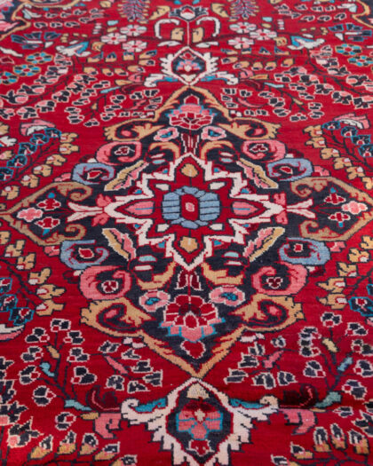 This is a vintage Persian wool rug showcasing a traditional design. The rug features an intricate all-over floral pattern with a prominent central medallion in red, blue, black and cream hues. The borders are elaborately detailed with repeating motifs. The rug is made of wool, giving it a soft texture and substantial weight. It's in good condition, with minor wear and age-related patina. This rug will add warmth and colour to a living room, dining room or bedroom.