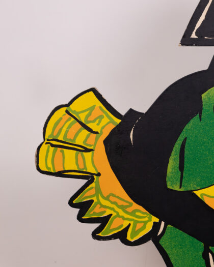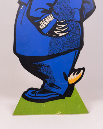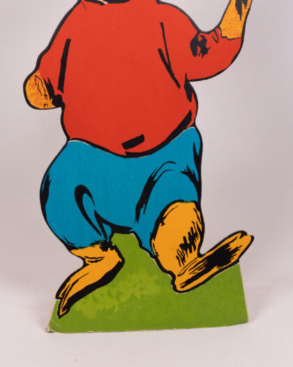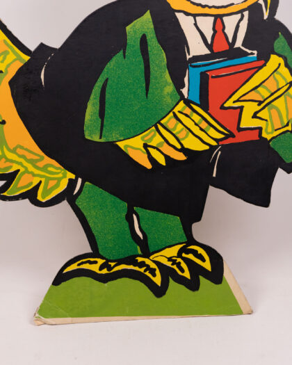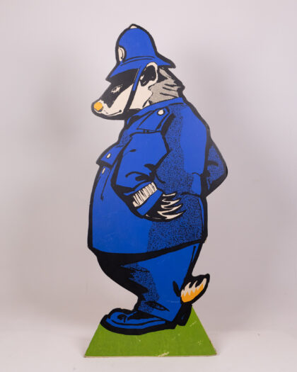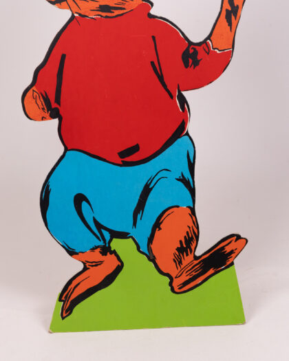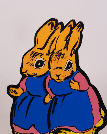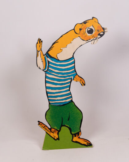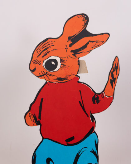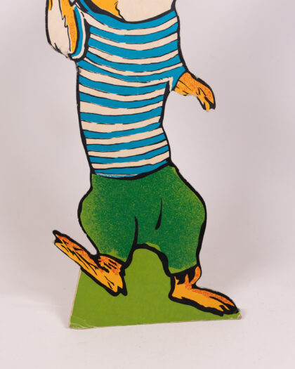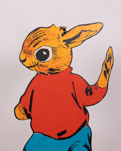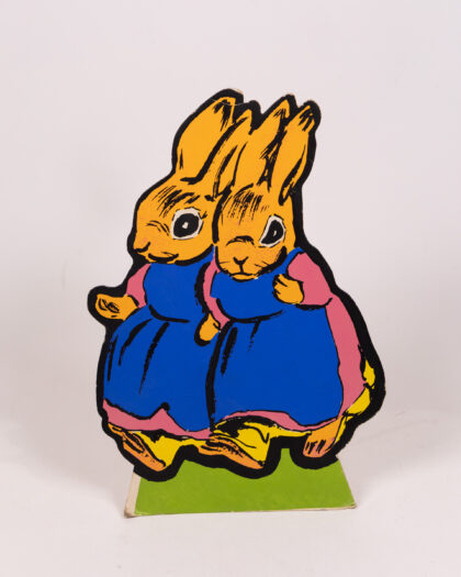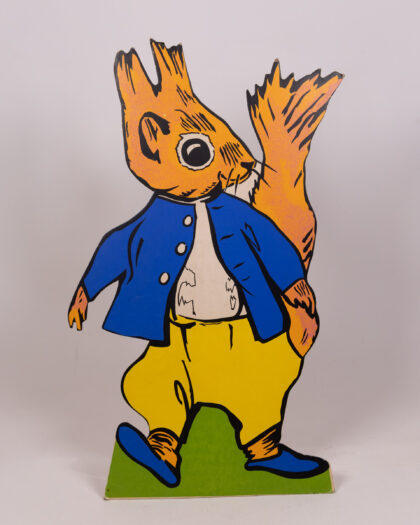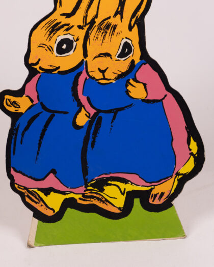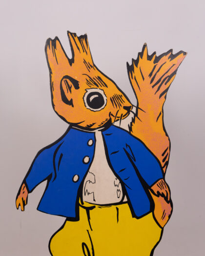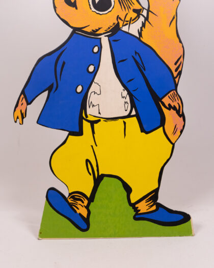 This vintage set features cardboard animal characters with vibrant designs. The characters each stand on a green base, including a badger in a policeman's uniform, a squirrel in yellow trousers, a rabbit in a red shirt and turquoise trousers, and an owl in graduation garb. This cheerful set would bring a playful touch to any room. Please note, only one peter rabbit is included.