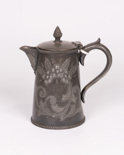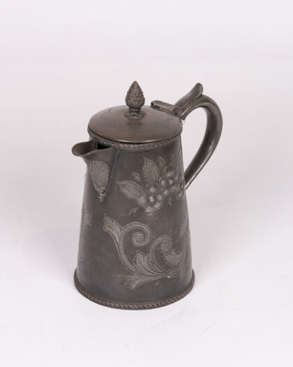 Vintage pewter coffee pot featuring an ornate floral design. Perfect for collectors or adding a touch of vintage charm to your home.