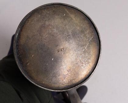 This vintage pewter coffee pot features a beautiful floral design etched into its surface. The pot has a hinged lid with a decorative finial. The handle is elegantly curved and the base is marked. The pewter has a lovely aged patina, adding to its vintage appeal. This piece would make a wonderful addition to any collection or a charming decorative item for your home.