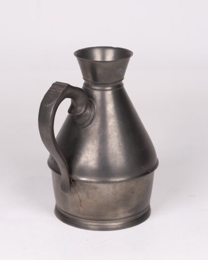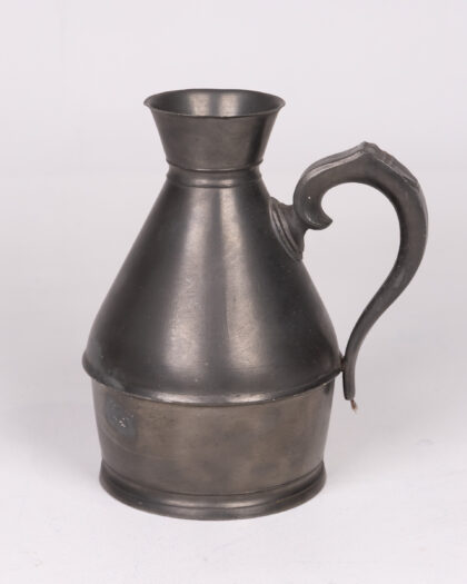 Vintage pewter flagon. This collectible flagon features a classic design with a conical body and a decorative handle. The flagon shows signs of wear consistent with its age, adding to its vintage charm. Perfect for collectors of pewterware or vintage kitchenalia. There are some minor scratches and dents, but overall the condition is good.
