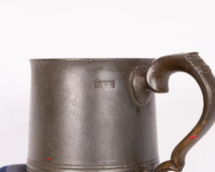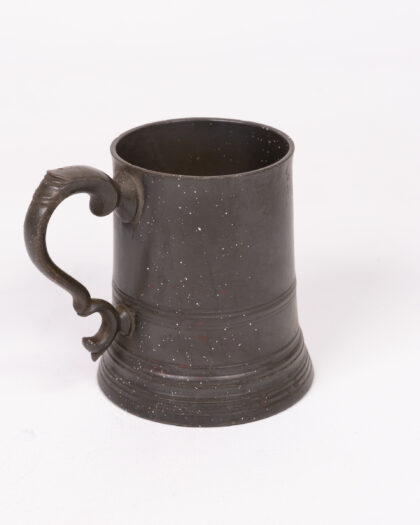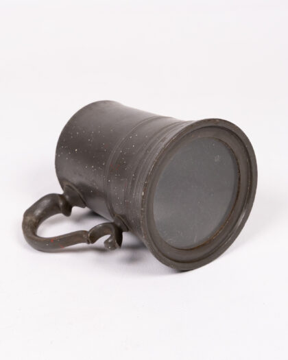 Vintage pewter tankard mug with decorative handle. Classic design, showing age and patina. Ideal for collectors or unique barware.