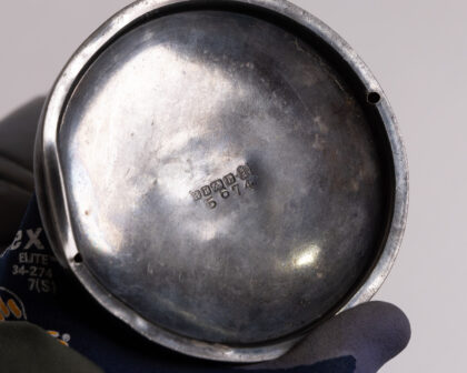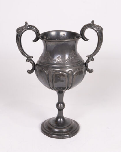 Vintage pewter trophy cup. Features ornate handles and a pedestal base. The base is stamped a maker's mark. This piece shows signs of age and use, adding to its vintage charm. Ideal for display or as a unique decorative item.